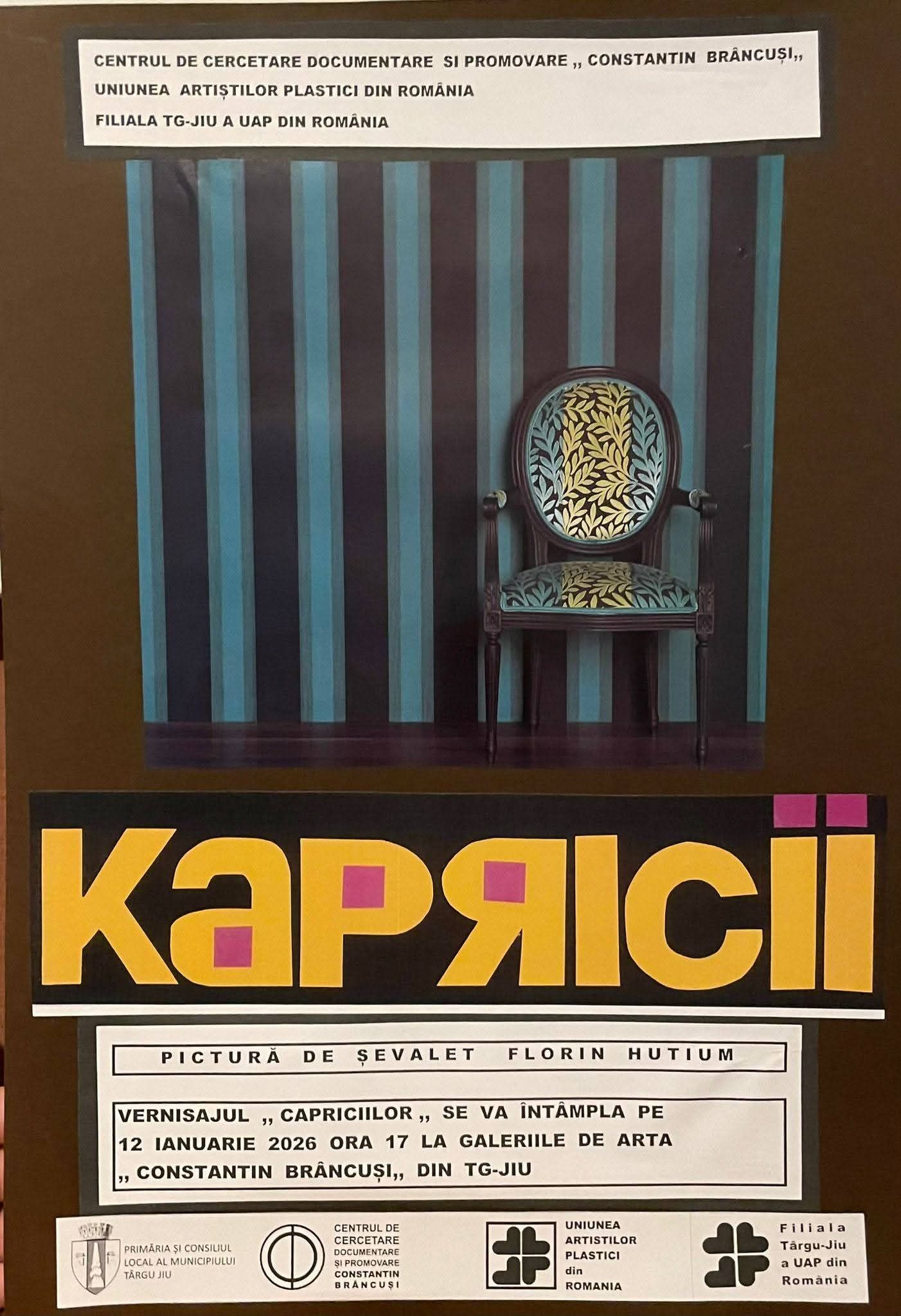 Expoziția propune un demers vizual expresiv și personal, în care libertatea creativă și jocul formelor definesc un univers artistic contemporan..Intrarea la acest eveniment este liberă, iar organizatorii vă îndeamnă să descoperiți ,,KAPRICII”, așa cum este conceput și asumat vizual de artist.