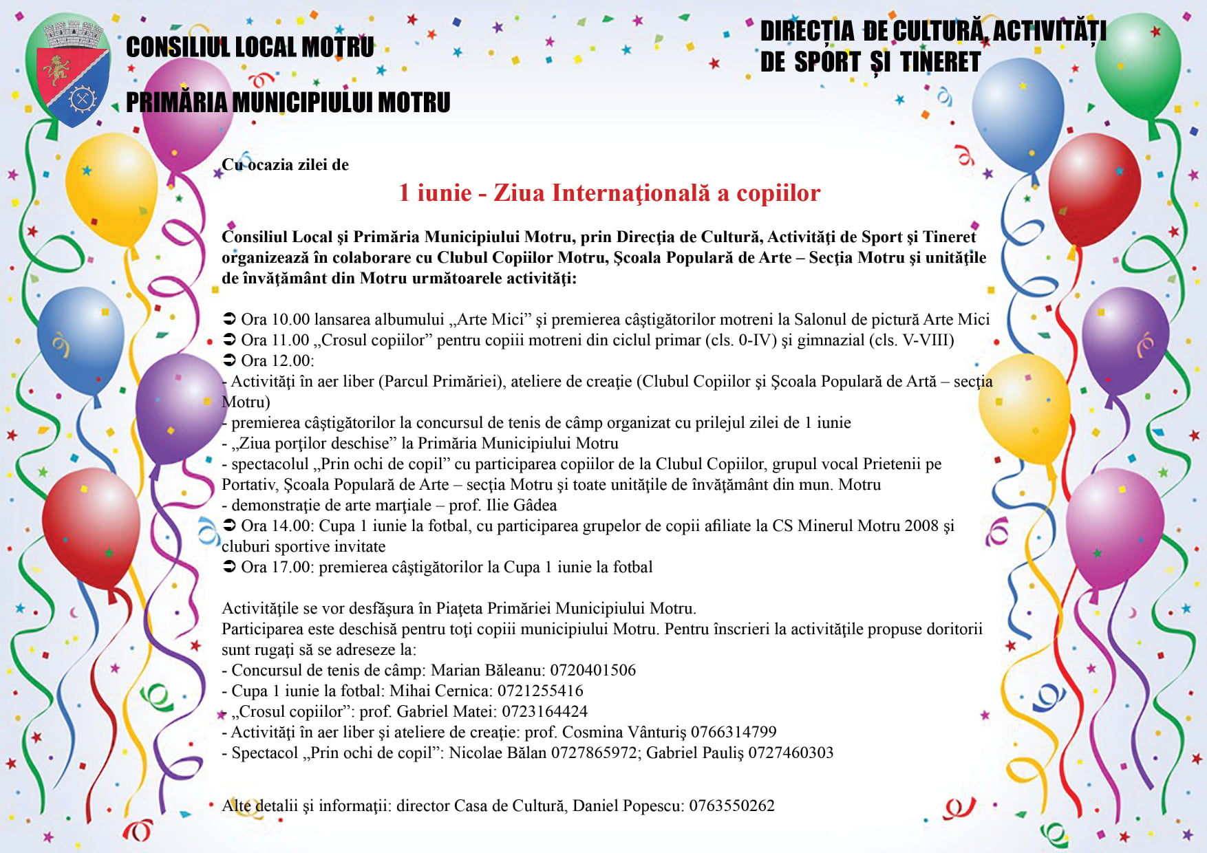 Cu ocazia zilei de 1 iunie: Ziua Internaţională a copiilor, Consiliul Local şi Primăria Municipiului Motru, prin Direcţia de Cultură, Activităţi de Sport şi Tineret, organizează în colaborare cu Clubul Copiilor Motru, Şcoala Populară de Arte – Secţia Motru şi unităţile de învăţământ din Motru următoarele activităţi: