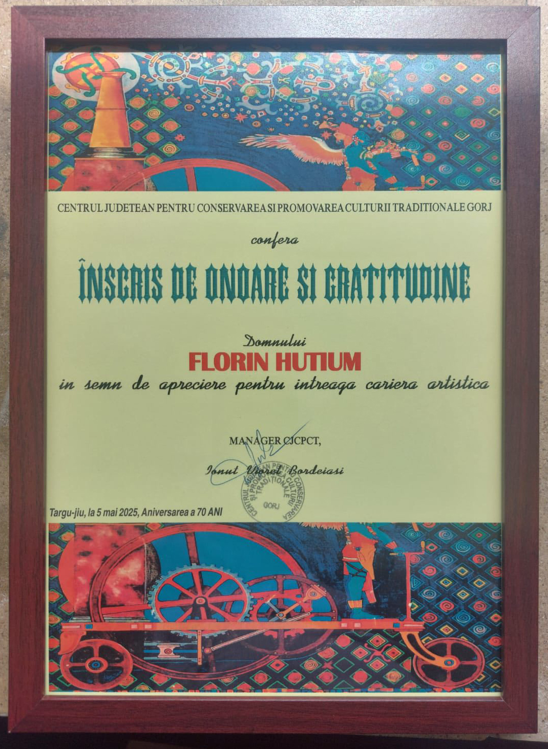 Demn de menționat este și faptul că artistul plastic Florin HUTIUM a primit, cu ocazia împlinirii frumoasei vârste de 70 de ani, un ,,Înscris de Onoare și Gratitudine, în semn de apreciere pentru întreaga carieră artistică, din partea Centrului Județean pentru Conservarea și Promovarea Culturii Tradiționale Gorj. Îi adresăm și noi pe această cale un sincer LA MULȚI ANI artistului gorjean Florin HUTIUM, căruia îi dorim sănătate și cât mai multe realizări profesionale și nu numai!
