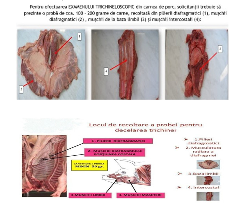 Potrivit DSVSA Gorj, examinarea trichineloscopică se efectuează atât pentru porcii identificați și înregistrați în Baza Națională de Date (B.N.D.), cât și pentru cei neidentificați. Probele se recoltează din limbă, mușchii intercostali, diafragm și mușchii maseteri.