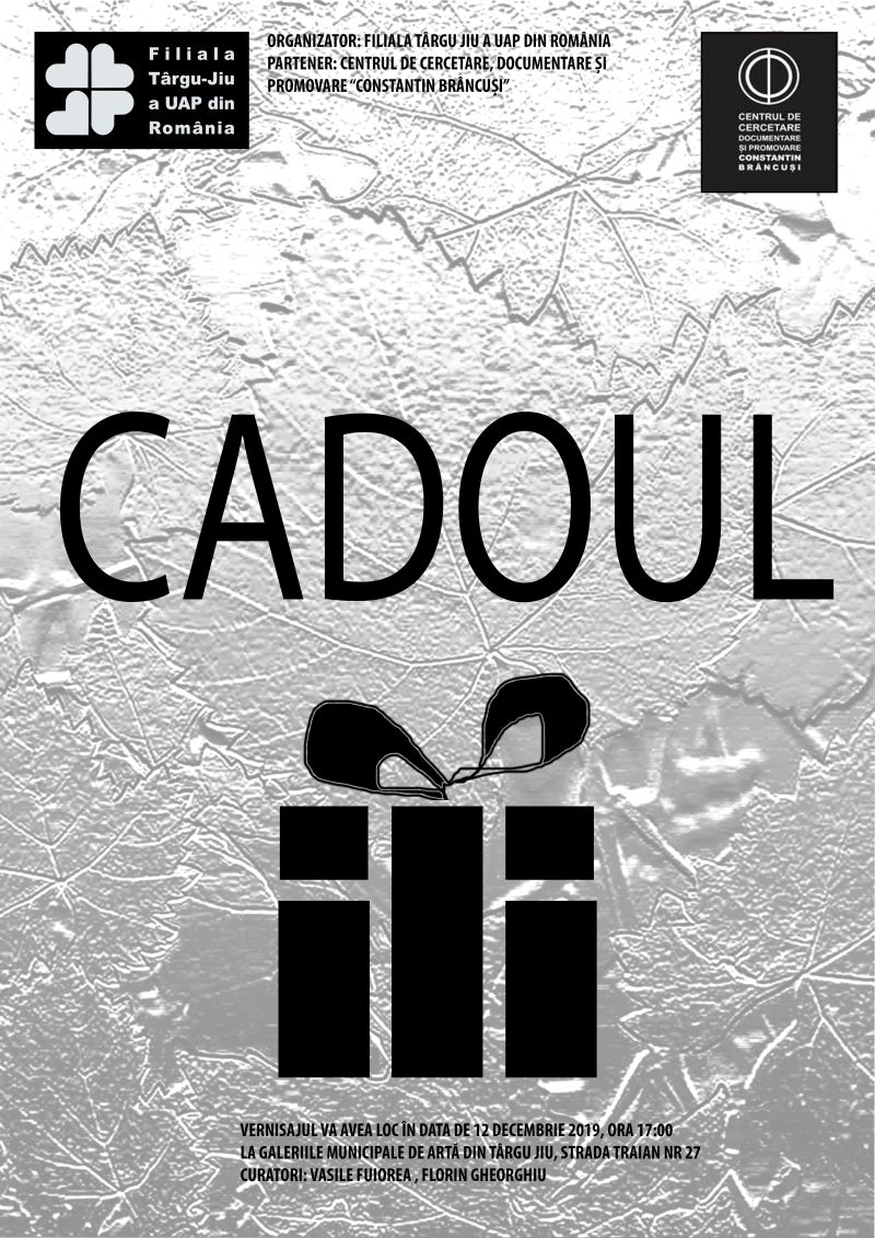 Filiala Târgu-Jiu a Uniunii Artiștilor Plastici din România în parteneriat cu Centrul de Cercetare, Conservare și Promovare „Constantin Brâncuși”, organizează joi, 12 decembrie 2019, ora 17.00, la Galeriile Municipale de Artă din Târgu-Jiu, vernisajul expoziției de grup „Cadoul”, a membrilor Filialei Târgu-Jiu a UAP din România. Curatori: Vasile Fuiorea, Florin Gheorghiu. Expoziția este deschisă publicului în perioada 12 decembrie 2019 – 15 ianuarie 2020.