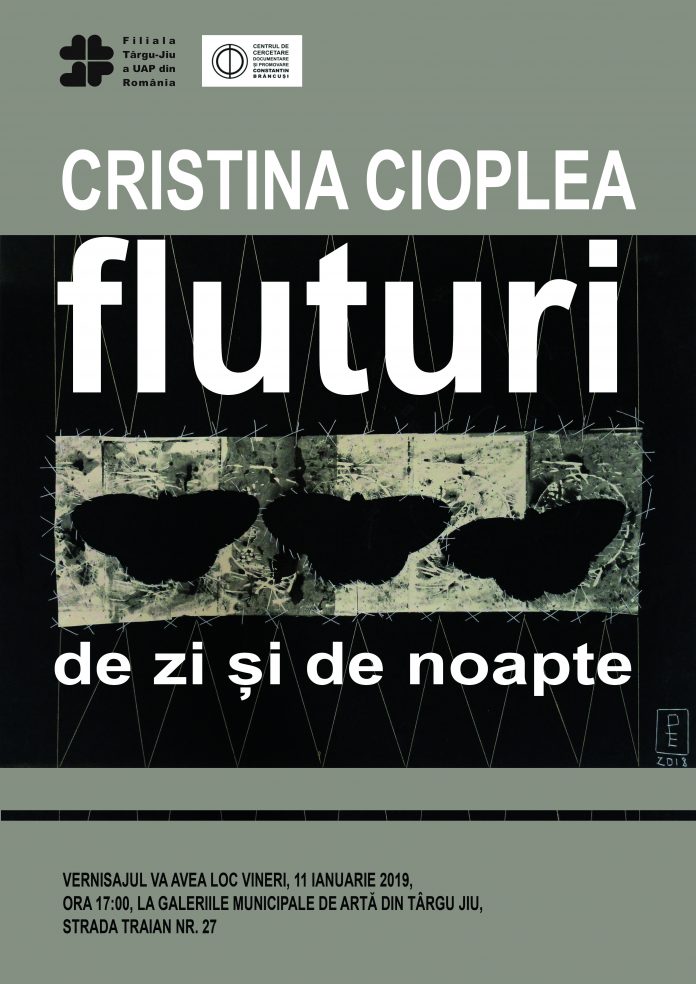 Filiala Târgu-Jiu a UAP din România, în parteneriat cu Centrul de Cercetare, Documentare și Promovare „Constantin Brâncuși” organizează vineri 11 ianuarie 2019, ora 17.00, vernisajul expoziției de arte vizuale „Fluturi de zi și de noapte”, realizat de Cristina Cioplea, membru titular al Filialei Târgu Jiu a UAP din România. Curator: Vasile Fuiorea, Florin Gheorghiu. Expoziția este deschisă publicului în perioada 11 ianuarie 2019–23 ianuarie 2019.