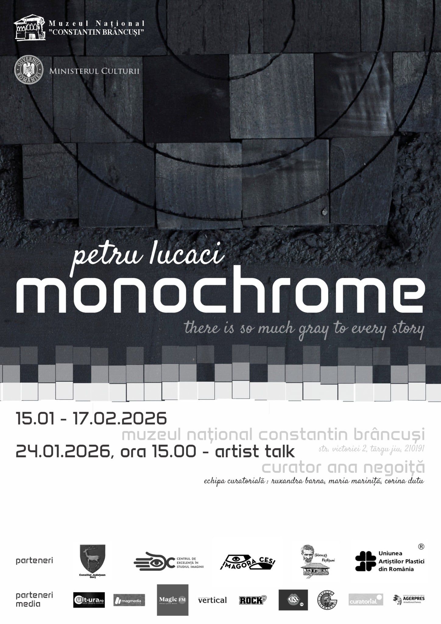 Expoziția „Monochrome. There is so much grey to every story” deschide, astfel, un amplu program de evenimente cultural-artistice dedicate Anului „Constantin Brâncuși”, demers cu profundă semnificație culturală, prin care este reafirmată importanța operei și personalității lui Constantin Brâncuși în patrimoniul cultural național și universal. „Brâncuși, supranumit părintele sculpturii moderne, nu este doar un reper al artei moderne, ci un simbol al valorilor culturale care definesc identitatea noastră. Anul Brâncuși creează un nou cadru de reflecție, iar muzeul are programate în 2026 numeroase proiecte culturale, educaționale și expoziționale, unele de anvergură internațională”, a declarat Denisa Șuță, managerul Muzeului Național „Constantin Brâncuși”.