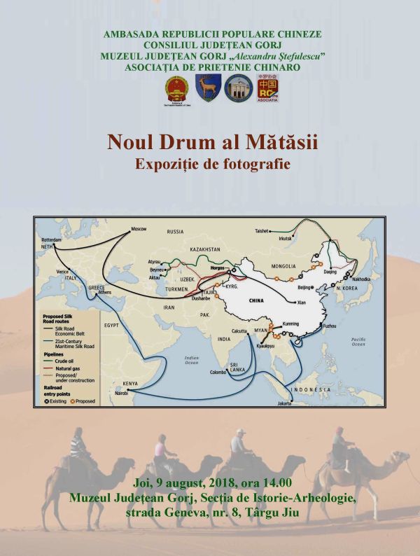 treimi din populația lumii. Până la sfârșitul anului 2017, au fost semnate 69 de acorduri de cooperare în cadrul Noului Drum al Mătăsii pentru proiecte de infrastructură rutieră, feroviară, maritimă. Pentru România, Noul Drum al Mătăsii reprezintă o șansă deosebită de investiții în diferite sectoare ale economiei, dar și de consolidare a relațiilor româno-chineze. Această nouă expoziție continuă colaborarea Muzeului Județean Gorj ”Alexandru Ștefulescu” din Târgu-Jiu cu Ambasada Republicii Populare Chineze la București, după expoziții precum ”China 2017”, ”Festivalul Primăverii – Anul Nou Chinezesc”, ”Monede Chinezești – O istorie de 3.000 de ani” și ”Frumusețile Chinei”. Expoziția temporară ”Noul Drum al Mătăsii” va putea fi vizitată în perioada 9 august – 9 septembrie 2018 la Muzeul Județean Gorj – secția de Istorie-Arheologie din Târgu-Jiu, strada Geneva, nr. 8.