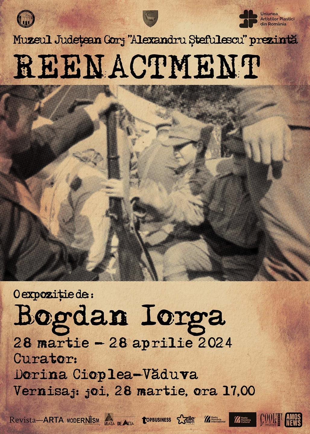 În această după-amiază, de la ora 17.00, la Muzeul Județean Gorj ”Alexandru Ștefulescu” (str. Geneva, nr. 8, Târgu Jiu), va avea loc vernisajul expoziției de fotografie ”Reenacment” a artistului Bogdan Iorga, curator Dorina Cioplea-Văduva.