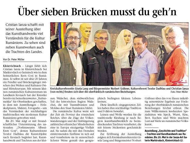 11160072_10206727331331609_4486787122016319923_oÎntr-o fotografie este redat unul dintre articolele apărute în presa bavareză intitulat „Şapte poduri peste care trebuie să treci”. Expoziţia va rămâne deschisă la Kronach, în oraşul Marktrodach (Germania) timp de o lună de zile, după care se va muta la Viena (Austria), într-o călătorie spirituală începută la germani.