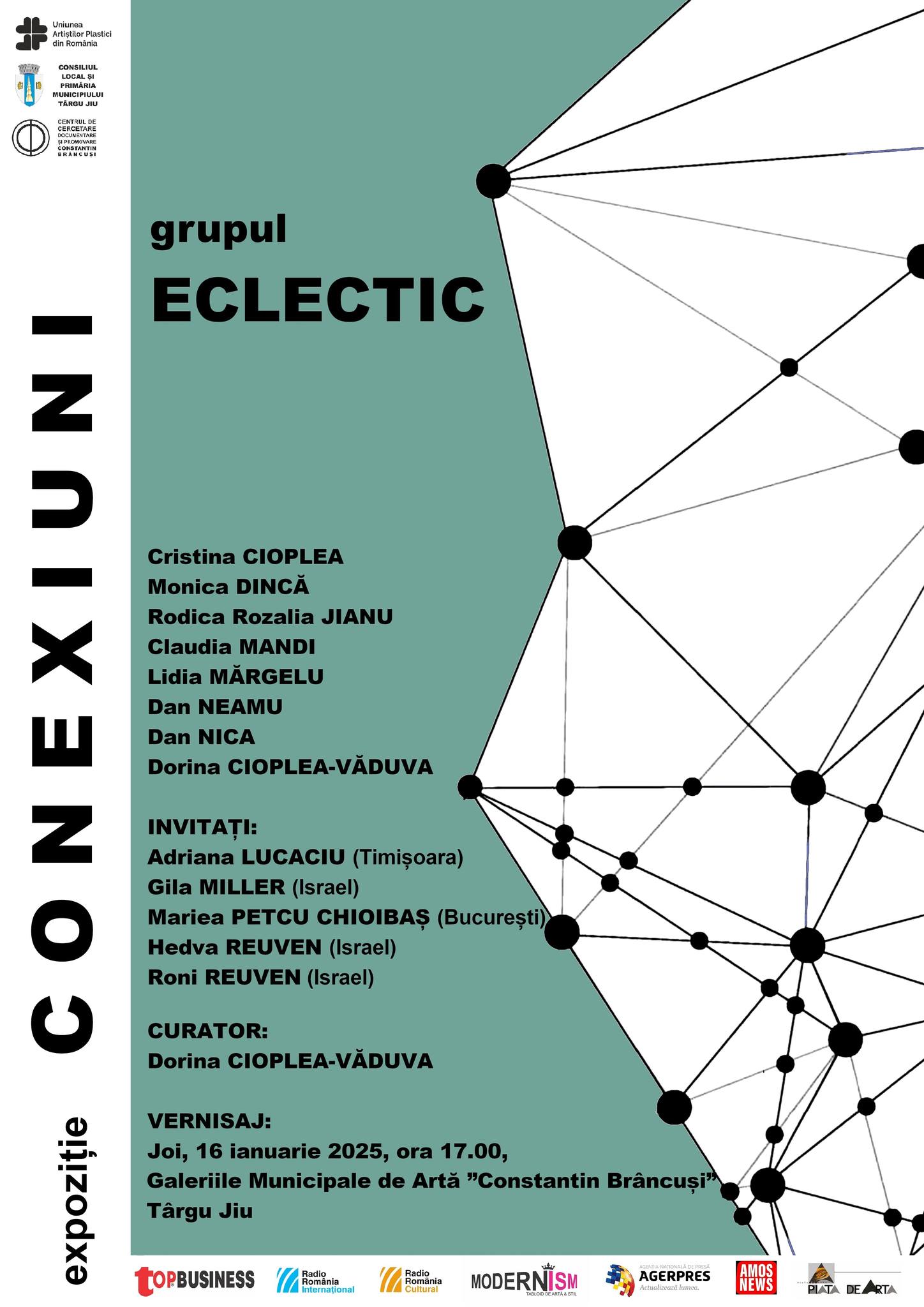 Joi, 16 ianuarie 2025, de la ora 17.00, Galeriile Municipale de Artă ”Constantin Brâncuși” Târgu Jiu găzduiesc vernisajul expoziției itinerante ”Conexiuni” realizată de grupul de artiști ”Eclectic”, format din Cristina Cioplea, Monica Dincă, Rodica Rozalia Jianu, Claudia Mandi, Lidia Mărgelu, Dan Neamu, Dan Nica și Dorina Cioplea-Văduva, și invitații Adriana Lucaciu (Timișoara), Gila Miller (Israel), Mariea Petcu Chioibaș (București), Hedva Reuven (Israel) și Roni Reuven (Israel). Curator al evenimentului expozițional este artista Dorina Cioplea-Văduva.