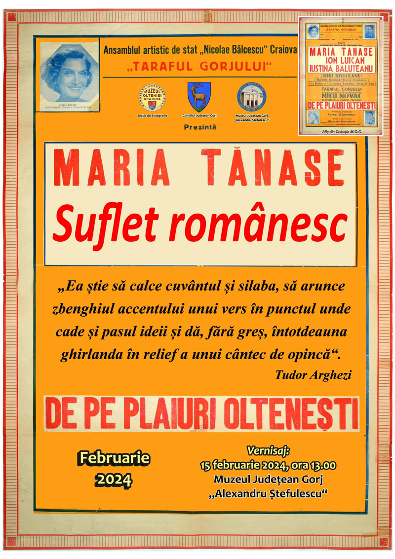 La Muzeul Județean Gorj ,,Alexandru Ștefulescu” din Târgu Jiu, str. Geneva, va avea loc astăzi, de la ora 13:00, vernisajul expoziției ,,Maria Tănase – Suflet românesc”, organizată de către Muzeul Olteniei Craiova, prin secția de Etnografie, în colaborare cu Muzeul Județean Gorj – ,,Alexandru Ștefulescu”.
