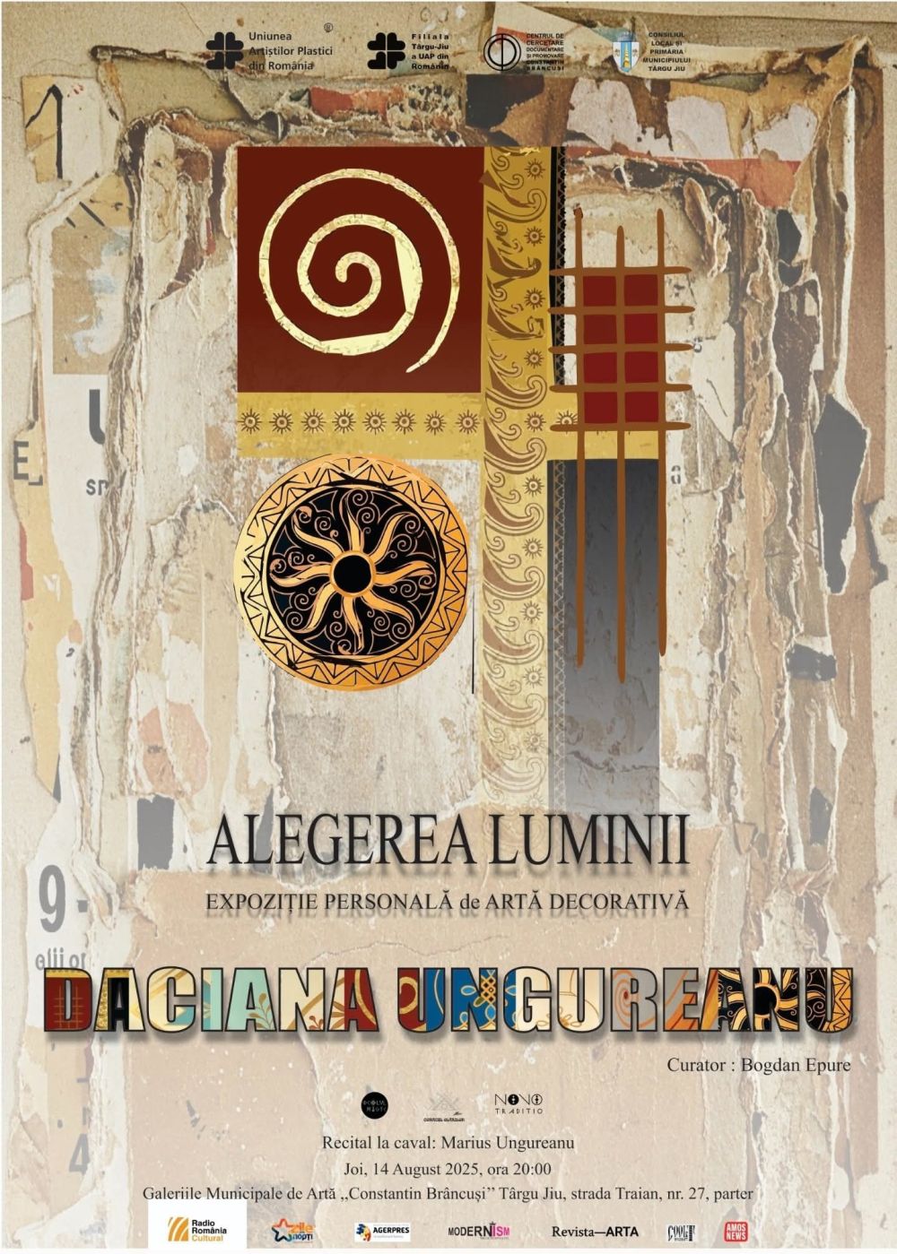 Filiala Târgu Jiu a Uniunii Artiștilor Plastici din România, în parteneriat cu Centrul de Cercetare, Documentare și Promovare „Constantin Brâncuși”, organizează joi, 14 august 2025, de la ora 20:00, vernisajul expoziției de artă decorativă „Alegerea Luminii”, semnată de artista Daciana Ungureanu.