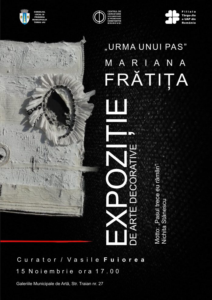 Filiala Târgu-Jiu a Uniunii Artiștilor Plastici din România în parteneriat cu Primăria Municipiului Târgu-Jiu, Centrul de Cercetare, Conservare și Promovare „Constantin Brâncuși”, organizează joi 15 Noiembrie 2018, ora 17.00, la Galeriile Municipale de Artă din Târgu-Jiu, vernisajul expoziției personale de Arte Decorative: „ Urma unui pas”, a artistei Mariana Frătița.