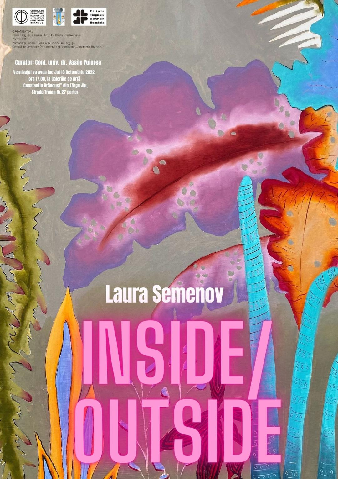 Filiala Târgu Jiu a Uniunii Artiștilor Plastici din România, în parteneriat cu Primăria Municipiului Târgu Jiu și Centrul de Cercetare Documentare și Promovare “Constantin Brâncuși”, organizează joi, 13 octombrie, ora 17.00., la Galeriile de Artă „Constantin Brâncuși” din Târgu Jiu, strada Traian nr. 27, parter, vernisajul expoziției personale de Arte Vizuale „INSIDE/OUTSIDE “, al artistei Laura SEMENOV .
