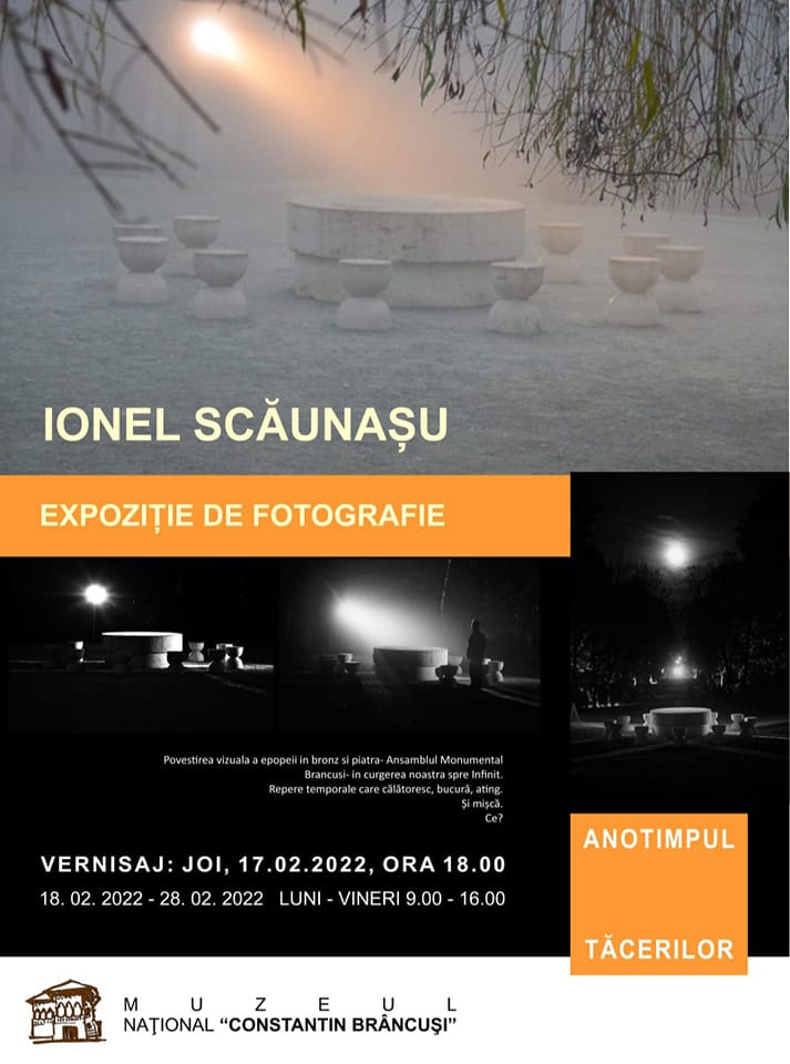 „Anotimpul tăcerilor” – expoziția de fotografie semnată de artistul fotograf Ionel Scăunașu va fi vernisată joi, 17 februarie, ora 18,00, la Muzeul Național „Constantin Brâncuși”.