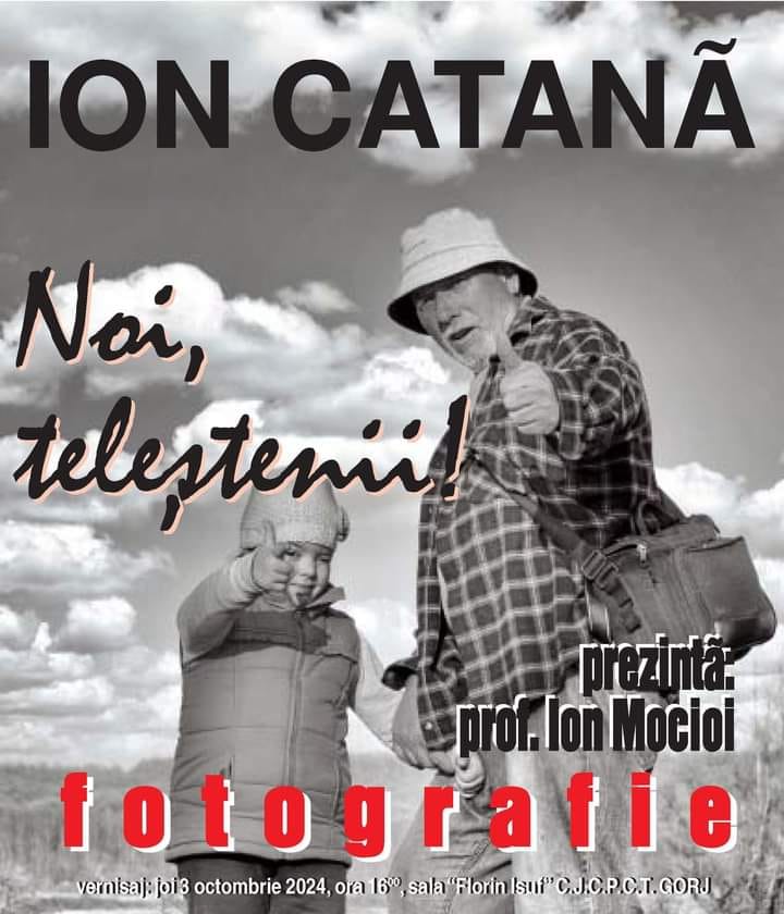 Centrul Județean pentru Conservarea și Promovarea Culturii Tradiționale (CJCPCT) Gorj organizează vernisarea expoziției de fotografie “Noi, teleștenii!”, semnată de cunoscutul fotograf Ion Catană. Evenimentul va avea loc mâine, 3 octombrie 2024, de la ora 16.00, la sala “Florin Isuf” a CJCPCT Gorj.