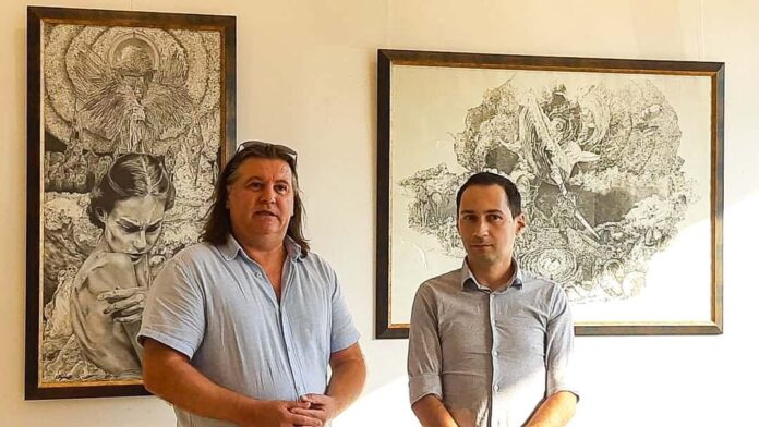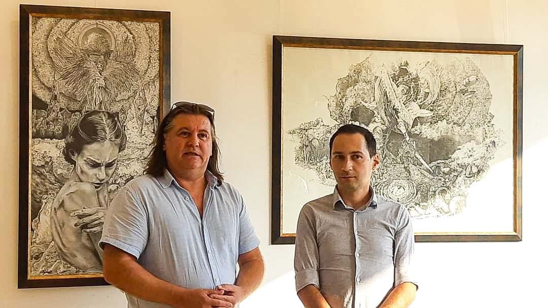 stăpânind o tehnică impresionantă de reprezentare artistică. Lucrează în mai multe tehnici, așa cum ar fi xilogravura, în lucrări care degajă o anumită forță, ce trimit spre expresionism. În alte lucrări, realizate în pix negru, creion și tuș pe hârtie, se vede o anumită sensibilitate, un registru cu gradații valorice, cu punct, linie, pată, elemente de limbaj discrete, lucrări care baleiază în jurul unei dexterități tehnice ce transmit un mesaj artistic important, bine conturat. Este vizibilă și preocuparea sa pentru figura umană, în special femeia, și este bine că o face. Chiar din titlu se poate înțelege că expoziția sugerează o interferență a unor crâmpeie de lumi, lucrări care se duc într-o tehnică pe care o găsesc suprarealistă. O altă componentă importantă este trimiterea la mitologie, românească și internațională. El culege din acest arsenal de elemente internaționale lucruri pe care le inserează în compozițiile sale. Este o expoziție impresionantă, fiecare lucrare necesitând un anumit timp de meditație”.