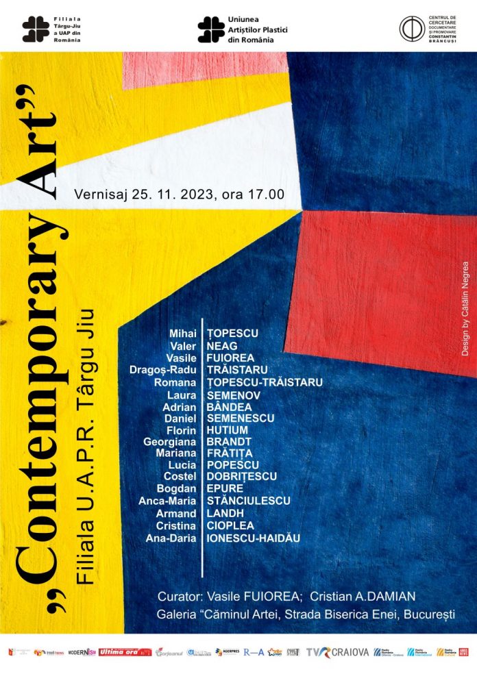 Filiala Târgu Jiu a UAP din România în parteneriat cu Filiala de Pictură București a UAP din România și Centrul de Cercetare Documentare și Promovare „Constantin Brâncuși”, organizează sâmbătă 25 noiembrie 2023, ora 17:00, la Galeria „Căminul Artei/Centrul Artelor Vizuale” din București, vernisajul expoziției de grup „Contemporary Art” a membrilor Filialei Târgu Jiu a UAP din România.
