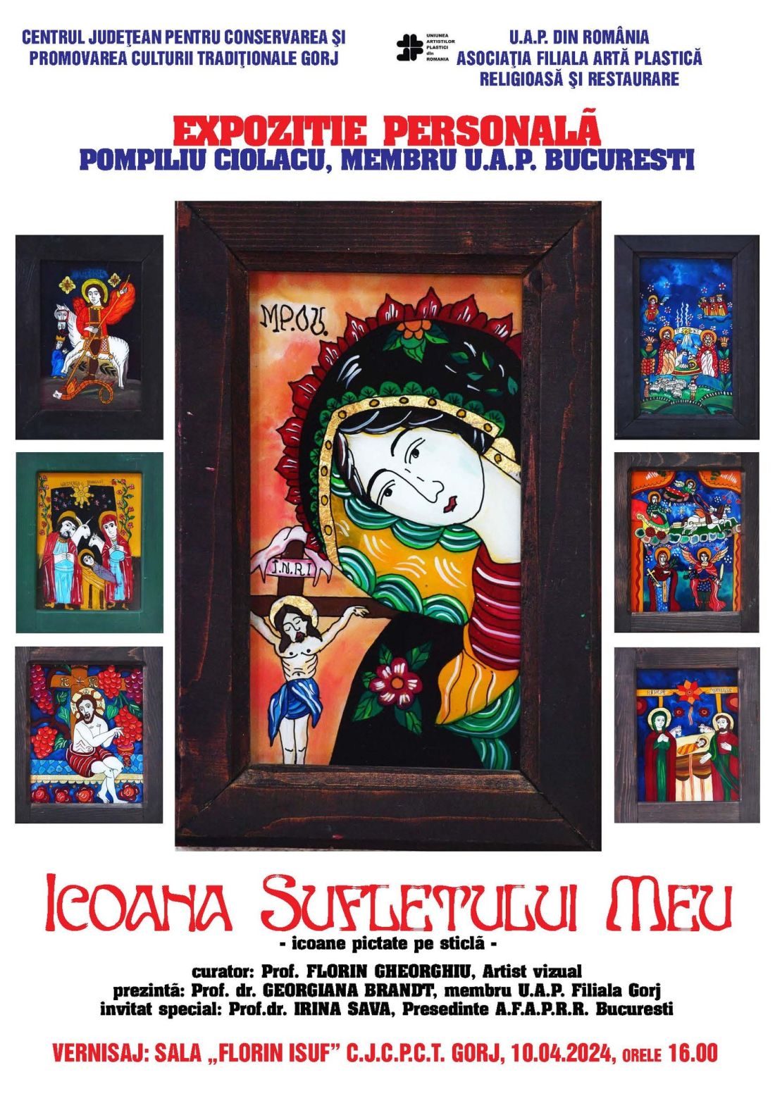 Manifestarea culturală aminitită va debuta de la ora 16.00, în sala “Florin Isuf” a Centrului Județean pentru Conservarea și Promovarea Culturii Tradiționale Gorj, iar curatorul expoziției este profesorul Florin GHEORGHIU, artist vizual. Expoziția de icoane pictate pe sticlă reprezintă o oportunitate de a explora și a aprecia frumusețea și profunzimea artei religioase, icoanele nefiind numai opere de artă, ci și adevărate mijloace de exprimare spirituală și de legătură cu Divinitatea. Această expoziție ne aduce în fața ochilor și a sufletului icoane realizate de către artistul Pompiliu CIOLACU, adevărate expresii ale artei religioase și cu o importanță culturală și spirituală aparte.