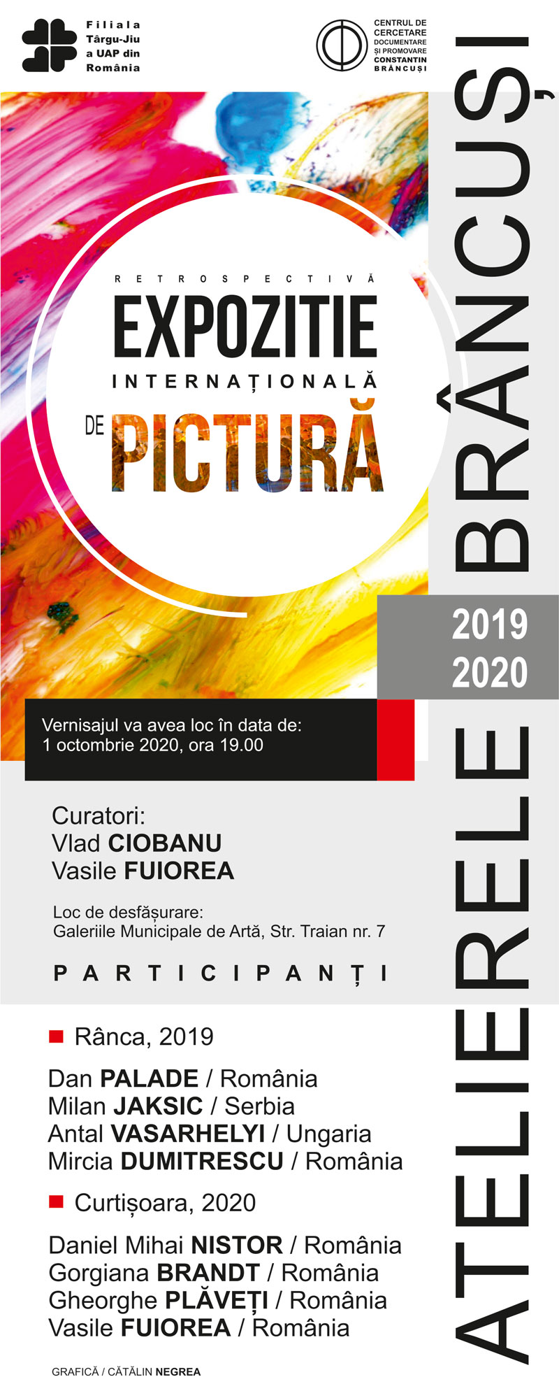Centrul de Cercetare Documentare și Promovare ,,Constantin Brâncuși” în parteneriat cu Filiala Târgu-Jiu a Uniunii Artiștilor Plastici (UAP) din România, organizează în această seară, de la ora 19.00, la Galeriile Municipale de Artă din Târgu-Jiu, Expoziția Retrospectivă de Pictură ,,Atelierele Brâncuși”, Simpozionul Internațional de Pictură, Ediția 2019, Rânca și Ediția 2020, Curtișoara. Curatorii expoziției sunt artiștii Vlad Ciobanu și Vasile Fuiorea.Artiști expozanți: Dan Palade (România), Mircia Dumitrescu (România), Milan Jaksic (Serbia), Antal Vasarhelyi (Ungaria), Daniel Mihai Nistor (România), Georgiana Brandt (România), Gheorghe Plăveți (România), Vasile Fuiorea (România). Expoziția va fi deschisă publicului, cu respectarea distanțării sociale în spațiile culturale, în perioada 1-14 octombrie 2020.