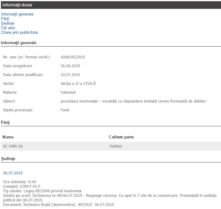În motivarea cererii de insolvenţă, debitoarea susţine că “acumulează o datorie totală de 24.887.874 de lei, din care suma de 9.623.081 de lei reprezintă datorii ajunse la scadenţă, fiind compusă din obligaţii bugetare în sumă de 941.712 de lei, obligaţii izvorând din raporturi de muncă, inclusiv contribuţiile sociale aferente acestor drepturi salariale neachitate în sumă de 1.620.618 de lei, credite bancare în suma de 698.995 de lei, obligaţii către furnizori și prestări servicii, creditori diverși în sumă de 6.010.850 de lei”. UMR SA mai precizează că i-a fost anulată eşalonarea la plată de către ANAF pentru neplata ratelor la timp.