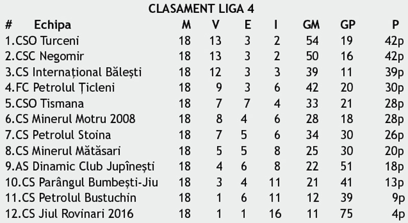 Etapa de Paște nu a adus surprize în ierarhia fotbalistică județeană din principalul campionat. La Liga 4, favoritele și-au confirmat statutul. Cele trei echipe din fruntea clasamentului au obținut succese în runda cu numărul 18. După cum arată lucrurile, Turceni, Negomir și Bălești își dispută titlul în acest sezon, unul în care Jiul Rovinari suferă, iar Petrolul Bustuchin s-a retras din competiție. În Seria 1 din Liga 5, Viitorul Plopșoru s-a distanțat în fruntea clasamentului, profitând și de rezultatul de la Bolboși, într-o etapă în care ,,iepurașul” a adus multe goluri. La fel s-a întâmplat în Seria 2, exceptând confruntarea de la Baia de Fier, unde, poate surprinzător, gazdele au pierdut un tempo în lupta pentru campionat. Gilortul Bengești a câștigat după un meci spectaculos la Dănești și conduce plutonul.