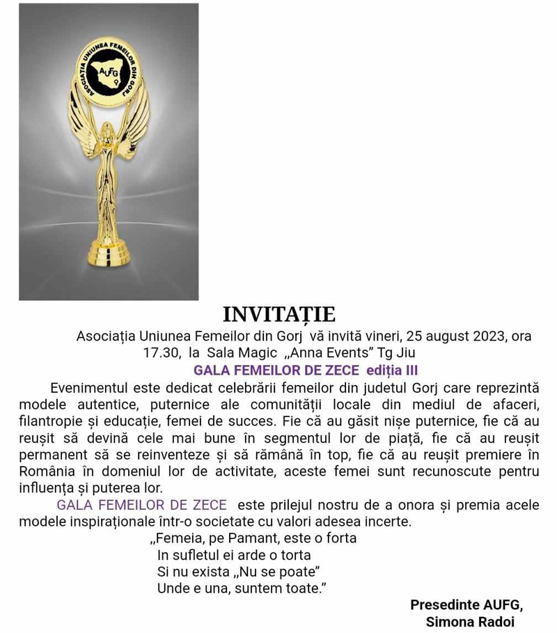 Asociația Uniunea Femeilor din Gorj organizează, așa cum ne-a obișnuit în fiecare an, GALA FEMEILOR DE 10. Evenimentul se află la a treia ediție și de fiecare dată au fost premiate femeile care și-au adus aportul în comunitatea gorjeană. Este vorba despre doamne care au performat în profesiile lor, care s-au remarcat prin fapte umanitare, au promovat arta, care au salvat vieți în spitalele din județ, avocate, doamne profesor, învățător, doamne care au pus pe picioare afaceri de succes, ori s-au implicat în proiecte sociale și educaționale.