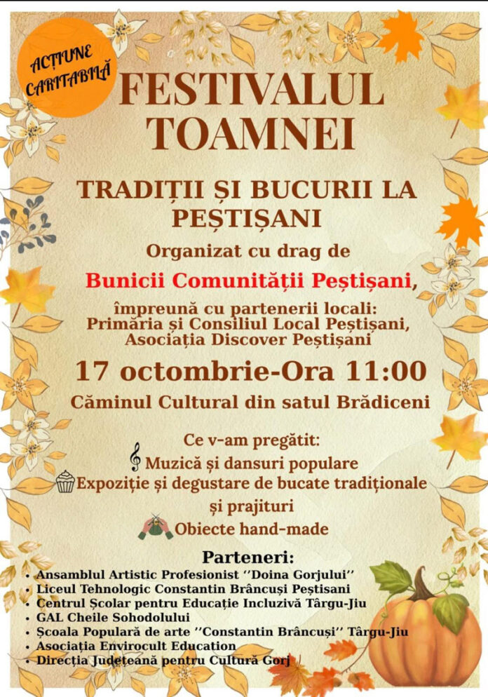 În cadrul festivalului, veți putea participa la: momente artistice de muzică și dansuri populare, expoziții și degustări de bucate tradiționale și prăjituri, prezentarea de obiecte hand-made realizate cu pasiune și talent. Evenimentul se desfășoară cu sprijinul partenerilor: Ansamblul Artistic Profesionist „Doina Gorjului”, Liceul Tehnologic „Constantin Brâncuși” Peștișani, Centrul Școlar pentru Educație Incluzivă Târgu-Jiu, GAL Cheile Sohodolului, Școala Populară de Arte Târgu-Jiu. Vă așteptăm cu deosebită considerație și drag să fiți alături de noi în celebrarea tradițiilor, bucuriilor și frumuseților toamnei”.