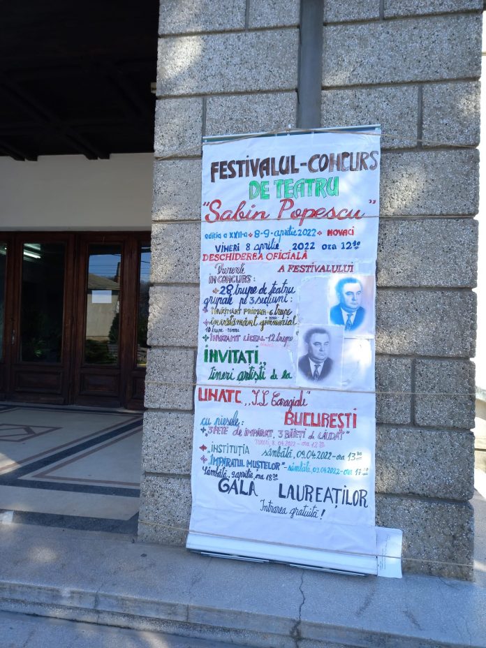 Casa de Cultură Novaci va fi gazda celei de a XXII-a ediții a Festivalului – Concurs de Teatru „Sabin Popescu”, timp de două zile, pe 8 și 9 aprilie. La concurs vor participa 28 de trupe de teatru din școlile și liceele județului Gorj. Acestea vor fi grupate pe trei secțiuni: învățământ primar, gimnazial și liceal. Peste 300 de elevi pasionați de lumea teatrului și aproximativ 50 de cadre didactice și actori în calitate de instructori vor fi prezenți.