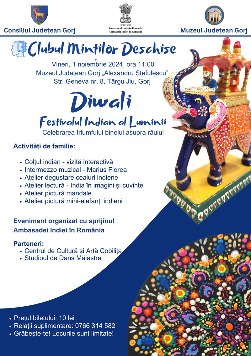 Muzeul Județean Gorj ,,Alexandru Ștefulescu” va organiza pe 1 noiembrie 2024, de la ora 11:00, evenimentul ,,Diwali” – Festivalul Indian al Luminii (Celebrarea triumfului binelui asupra răului). ,,Din program vor face parte o serie de activități de familie: • Colțul indian – vizită interactivă; • Intermezzo muzical – Marius Florea; • Atelier degustare ceaiuri indiene; • Atelier lectură – India în imagini și cuvinte; • Atelier pictură mandale; • Atelier pictură mini-elefanți indieni. Evenimentul este organizat cu sprijinul Ambasadei Indiei în România, parteneri fiind și Centrul de Cultură și Artă Cobilița, precum și Studioul de Dans Măiastra”, au anunțat reprezentanții Muzeului Județean Gorj. Pentru acest eveniment, participanții trebuie să știe că locurile sunt limitate, iar prețul unui bilet de acces este de doar 10 lei.