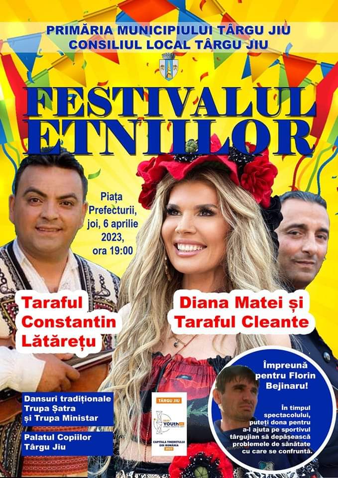 Festivalul Etniilor are loc în această săptămână la Târgu-Jiu. Publicul este invitat joi, 6 aprilie, de la ora 19.00, la spectacolul susținut de cunoscuta artistă Diana Matei și Taraful Cleante, de taraful Constantin Lătărețu, Palatul Copiilor Târgu-Jiu și trupele de dansuri Șatra și Ministar.