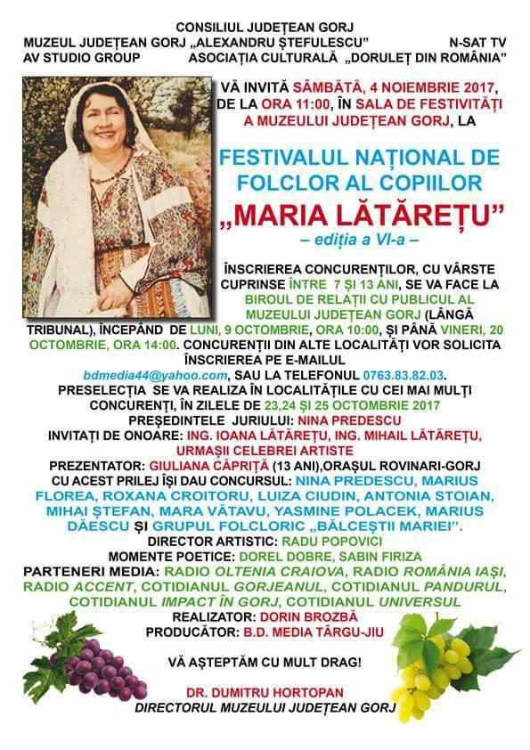 Cea de-a VI-a ediție a Festivalului Național de Folclor al Copiilor “Maria Lătărețu” se va desfășura la Târgu-Jiu, în data de 4 noiembrie. Gazda festivalului va fi Muzeul Județean Gorj, iar startul înscrierilor a fost dat încă din 9 octombrie și se vor încheia pe 20 octombrie.