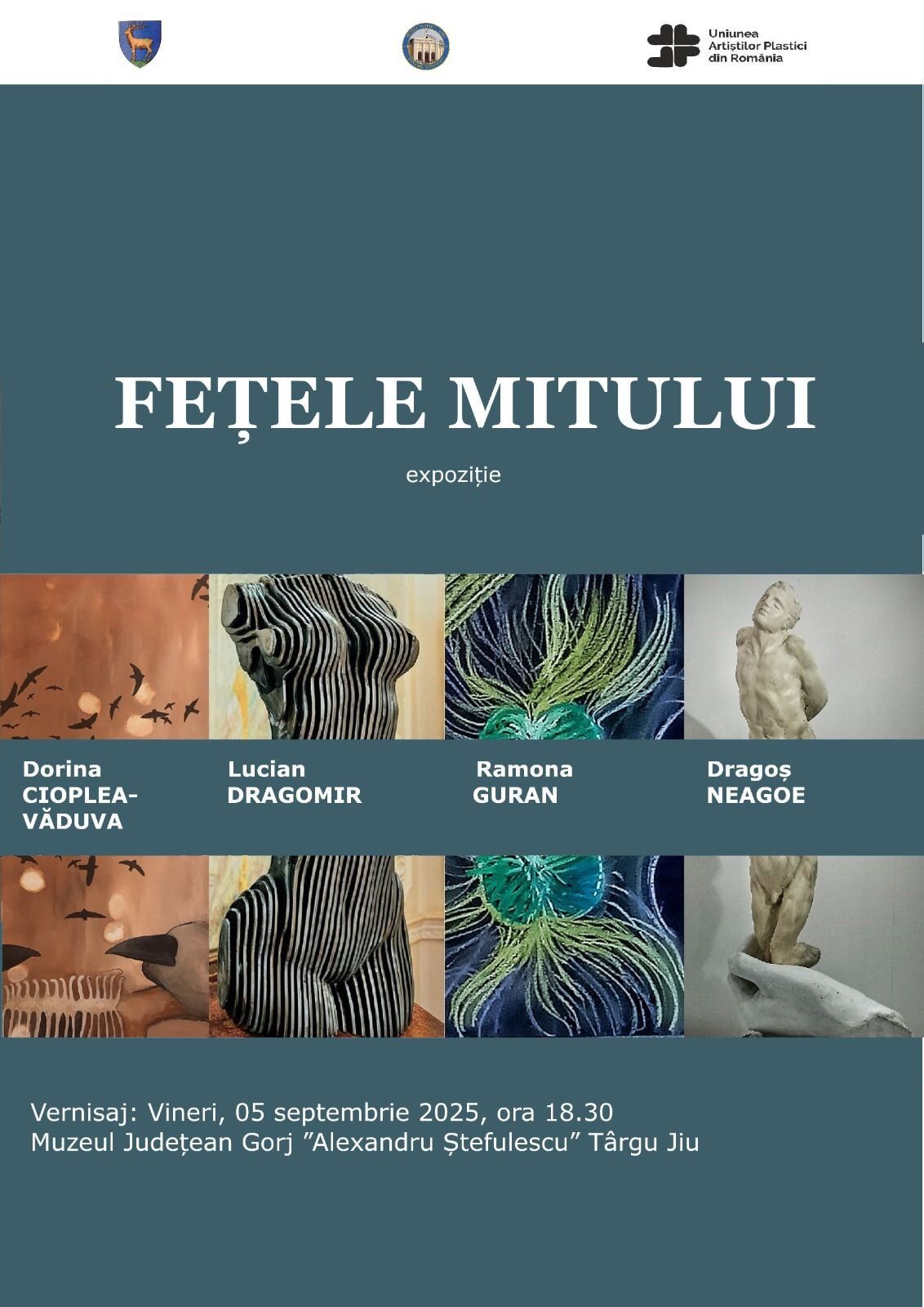 Vineri, 5 septembrie 2025, de la ora 18:30, la Muzeul Județean Gorj ”Alexandru Ștefulescu” din Târgu Jiu va avea loc vernisajul expoziției de pictură și sculptură ”Fețele mitului”, care aduce pe simezele târgujiene artiștii Dorina Cioplea-Văduva, Lucian Dragomir, Ramona Guran și Dragoș Neagoe.