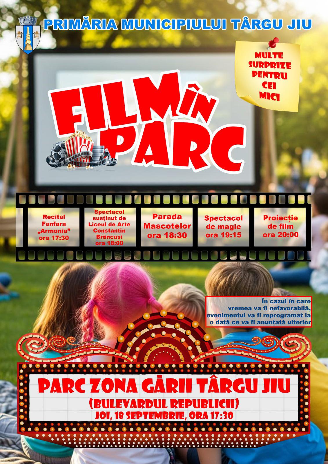 Primăria Târgu Jiu anunță o nouă ediție a evenimentului „Film în parc”, care va avea loc joi, 18 septembrie, începând cu ora 17:30, în parcul din zona Gării (Bulevardul Republicii).