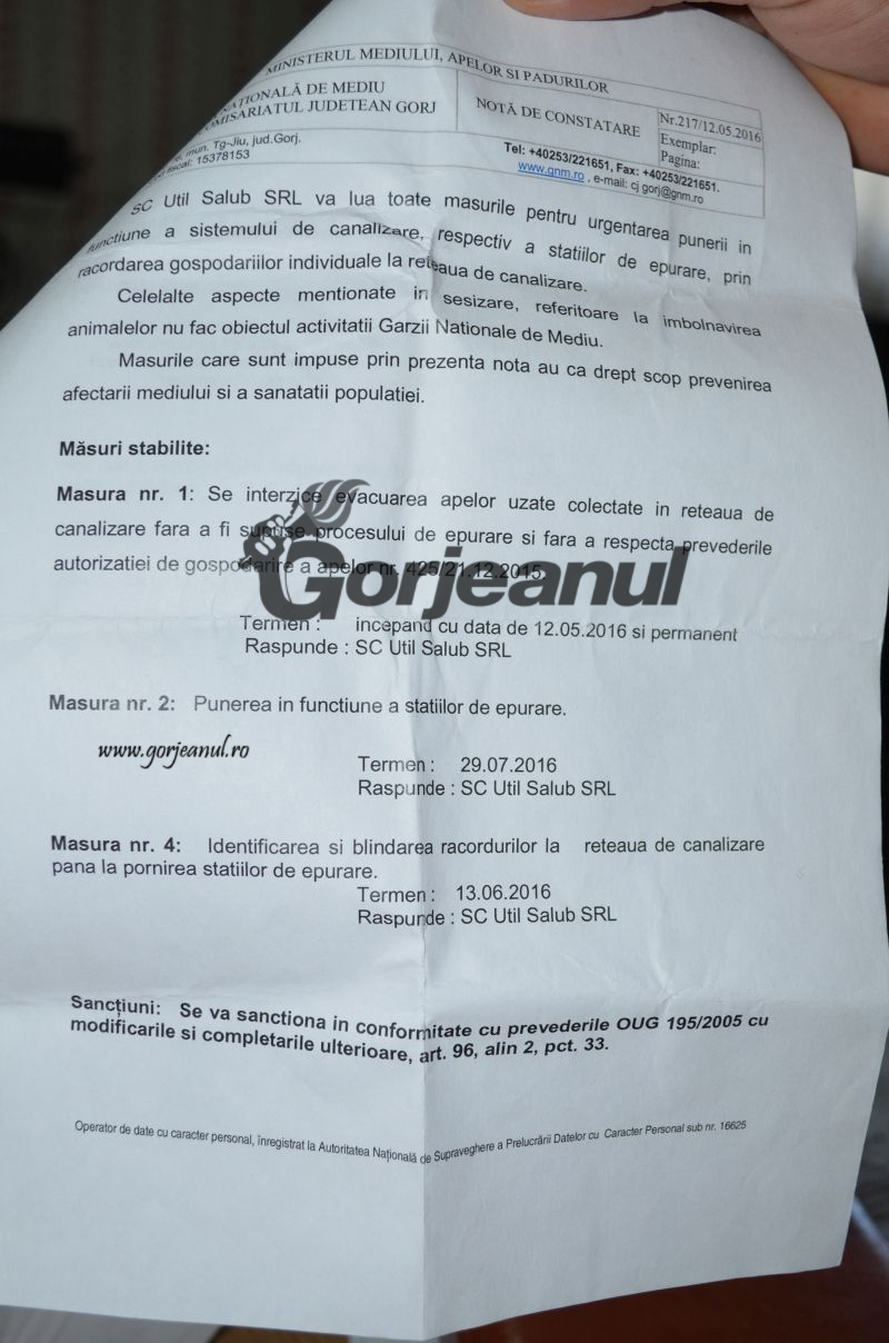 Garda de Mediu Gorj i-a impus lui Rotaru, ca în 30 de zile, să identifice și să blindeze racordurile la rețeaua de canalizare, până la pornirea stațiilor de epurare. Termenul de realizare expira pe 13 iunie 2016.