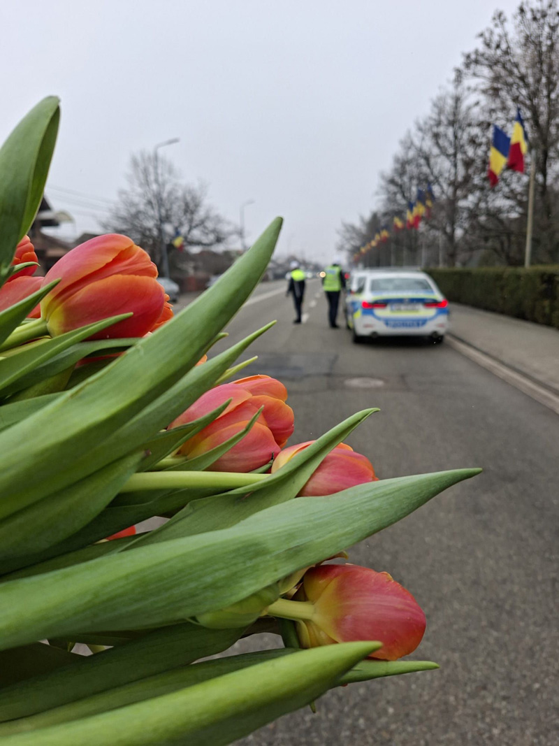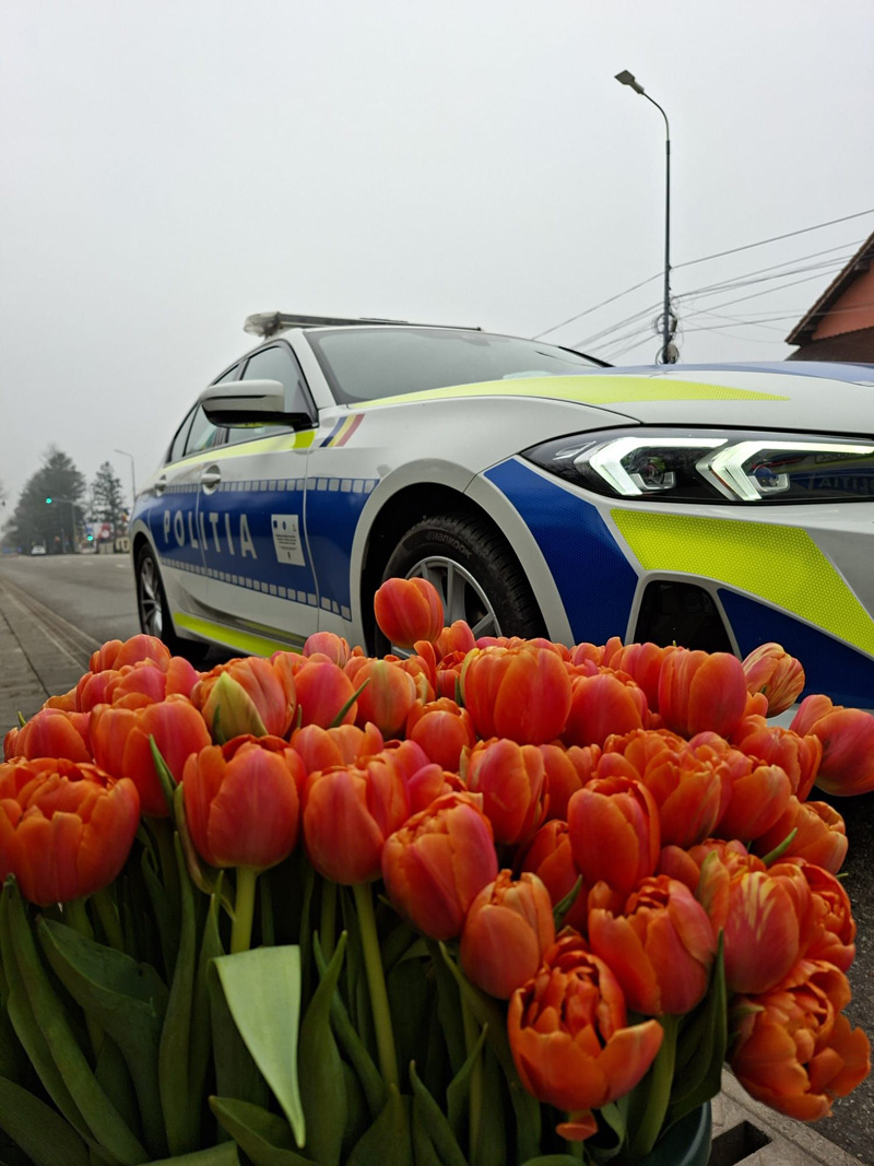 ,,La mulți ani! Să aveți o primăvară frumoasă! Din partea Serviciului Rutier… o floricică”, a spus unul dintre polițiștii care au dăruit lalele.
