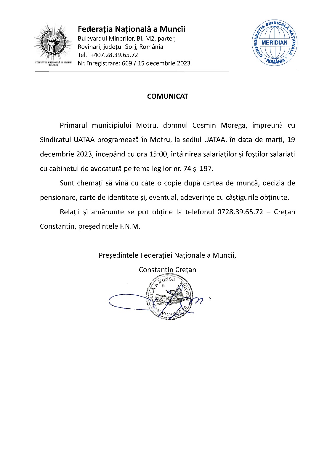 Și salariații UATAA Motru pot beneficia de prevederile legilor 74 și 197. Federația Națională a Muncii condusă de Constantin Crețan îi invită pe aceștia, dar și pe foștii salariați ai uzinei de termoficare din municipiu Motru, la o întâlnire cu avocații. După cum se știe, FNM a intermediat întâlnirile între salariații CEO, și a foștilor salariați ai companiei, și casele de avocatură, firme de consultanță în domeniu, cu care federația a încheiat parteneriate, tocmai pentru a-i sprijini pe cei care au muncit zeci de ani în condiții grele să beneficieze de tot ce le conferă prevederile aflate în vigoare.