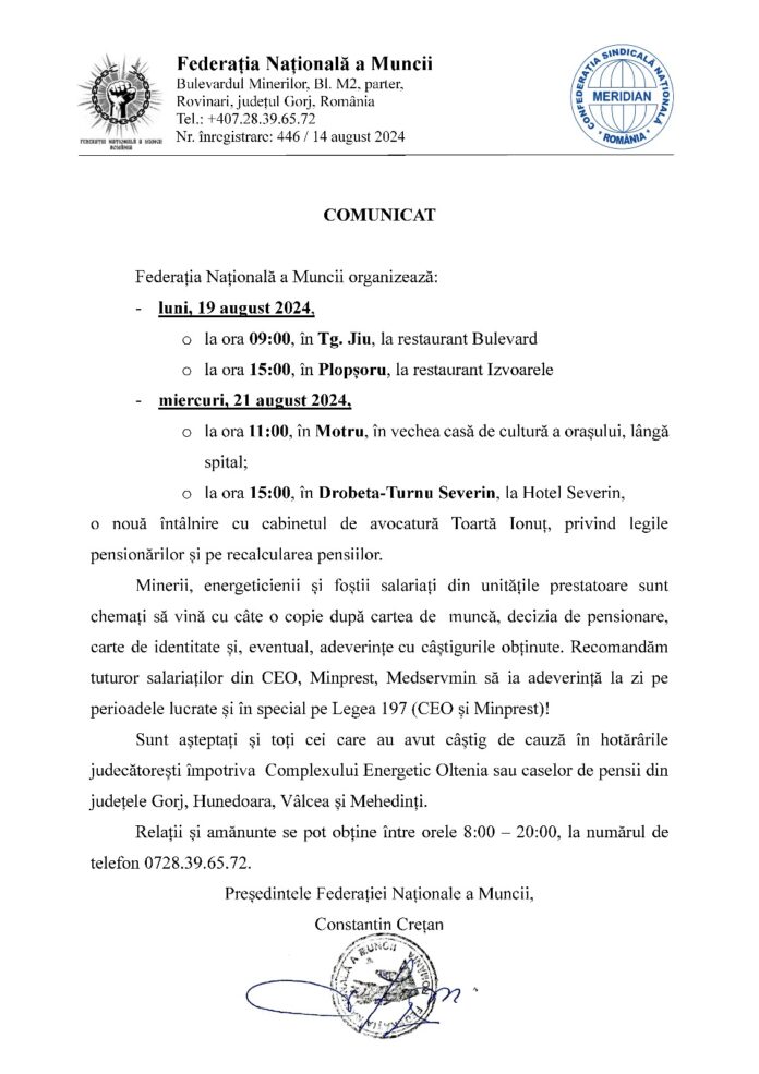 Federația Națională a Muncii anunță programul întâlnirilor salariaților și foștilor salariați cu avocatul care îi reprezintă în instanțele de judecată. Astfel, luni, 19 august, avocatul Ionuț Toartă va purta discuții cu oamenii la Târgu Jiu și Plopșoru, iar miercuri, 21 august, la Motru și Drobeta Turnu Severin. Recomandarea FNM, condusă de Constantin Crețan, este ca salariații CEO, Minprest și Medserv Min să vină cu adeverințele actualizate, pentru a putea beneficia de Legea 197, acestea fiind necesare la dosarul de pensionare.