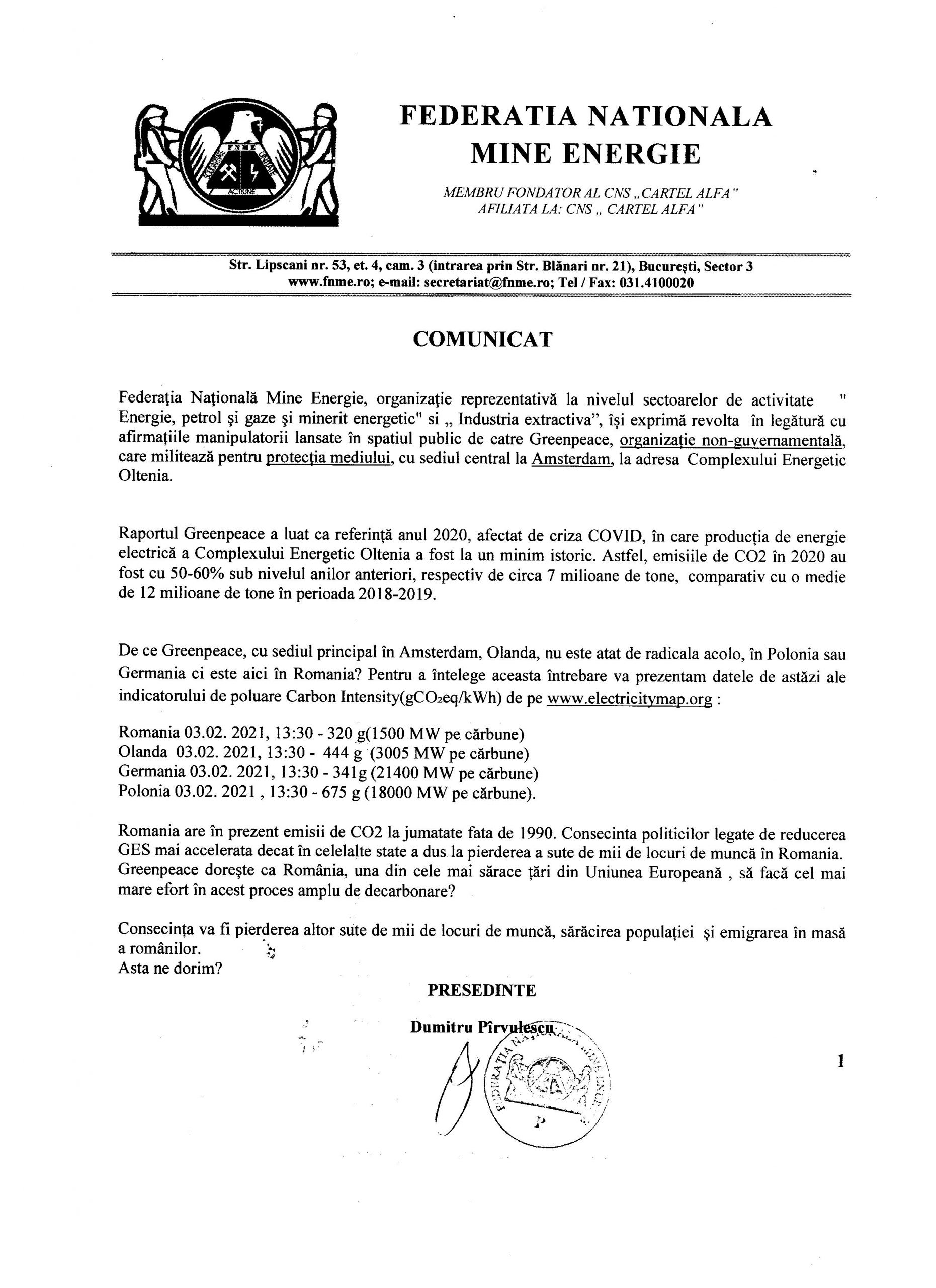 Federaţia Naţională Mine Energie „își exprimă revolta în legătură cu afirmațiile manipulatorii lansate în spatiul public de catre Greenpeace, organizație non-guvernamentală, care militează pentru protecția mediului, cu sediul central la Amsterdam, la adresa Complexului Energetic Oltenia”.