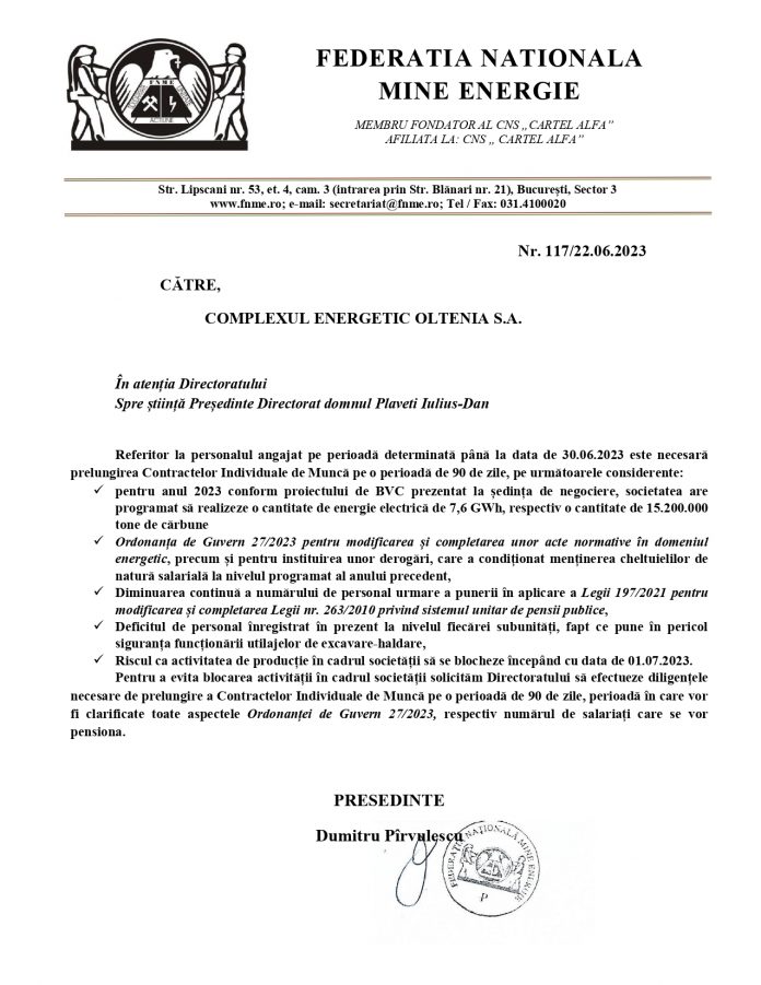 „Pentru a evita blocarea activității în cadrul societății, solicităm Directoratului să efectueze diligențele necesare de prelungire a Contractelor Individuale de Muncă pe o perioadă de 90 de zile, perioadă în care vor fi clarificate toate aspectele Ordonanței de Guvern 27/2023, respectiv numărul de salariați care se vor pensiona”, susține FNME.