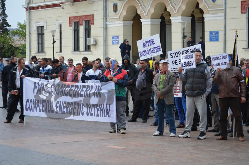 Un număr de circa 500 de membri ai Federației Naționale Mine Energie au protestat, sâmbătă la prânz, în centrul municipiului, împotriva conducerii Complexului Energetic Oltenia, manifestanții cerând de mai multe ori demisia lui Laurențiu Ciurel, mai ales după ce acesta a anunțat că 200 de ortaci ar urma să devină paznici. Sindicaliștii spun că nu au fost consultați și nu agreează o astfel de decizie, dorința lor fiind de a negocia cu administrația, lucru care pare imposibil pentru moment.