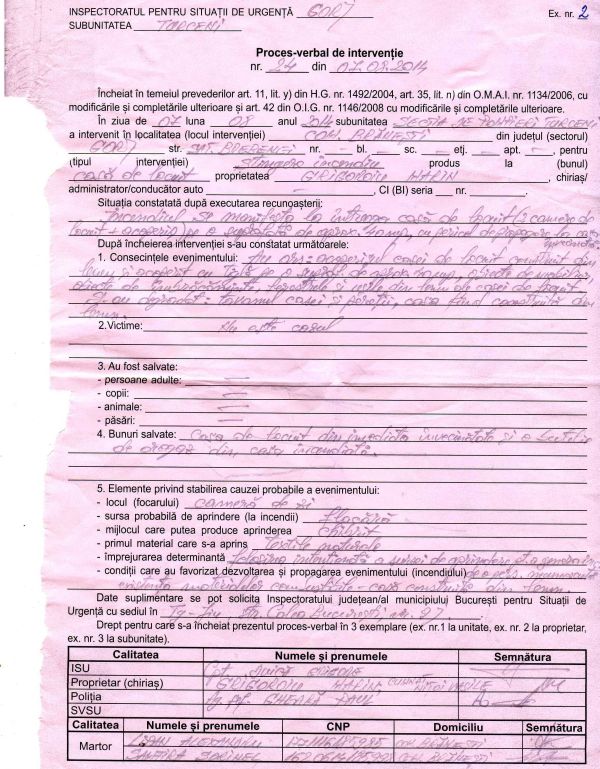 Procesul verbal al ISU: “Folosirea intenţionată a sursei de aprindere pentru a genera incendiul”