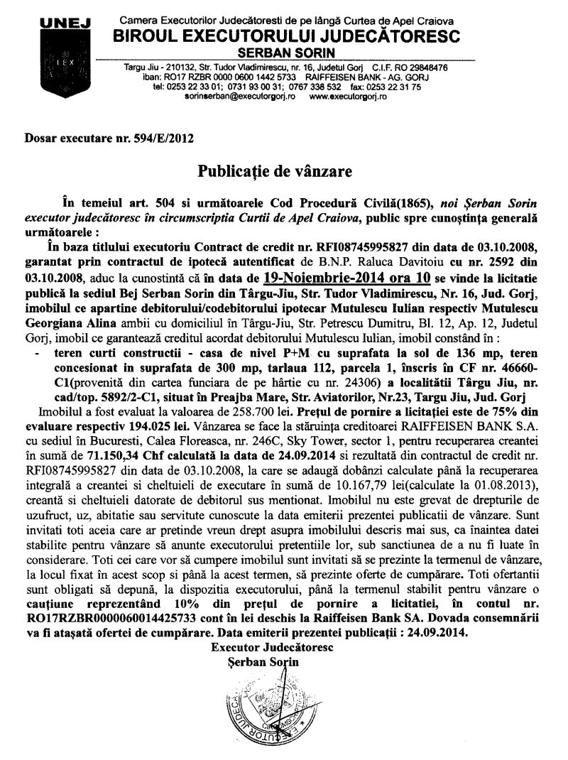 Iulian şi Georgiana Mutulescu sunt printre miile de gorjeni debitori asupra cărora băncile prin care au contractat un credit i-au executat pentru neplata ratelor. În urma schimbării domiciliului soţilor Mutulescu de la Târgu-Jiu la Cluj-Napoca, din urmă cu aproape doi ani de zile, cei doi au renunţat la plata ratelor, astfel că în august 2013 imobilul a fost scos la vânzare prin executare silită de către un executor judecătoresc din Târgu-Jiu.