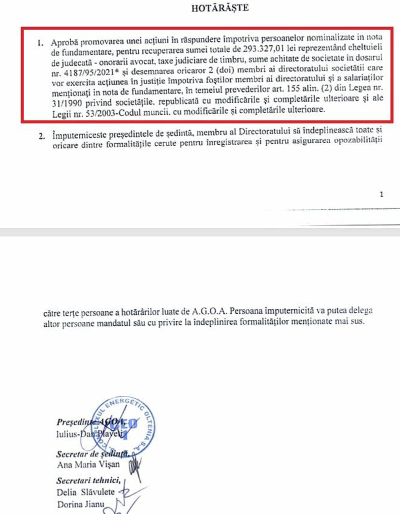 Acționarii CEO au aprobat, recent, inițierea unei acțiuni în răspundere împotriva foștilor membri ai Directoratului care au decis, în august 2021, să acționeze în judecată fosta conducere a companiei care, la finele lui 2013 și începutul lui 2014, a acordat economia la fondul de salarii angajaților companiei energetice. Este vorba despre 300.000 de lei pe care CEO i-a achitat cu titlu de cheltuieli de judecată, după ce procesul a fost pierdut definitiv la Înalta Curte de Casație și Justiție. Culmea este că și atunci, tot acționarii companiei, adică Adunarea Generală Extraordinară a Acționarilor a aprobat promovarea unei acțiuni în răspundere în vederea recuperării unei sume colosale stabilită în urma măsurilor dispuse printr-o decizie a Curții de Conturi a României, însă reprezentantul statului de acum în CEO nu spune nimic despre hotărârea aprobată de predecesorul său.