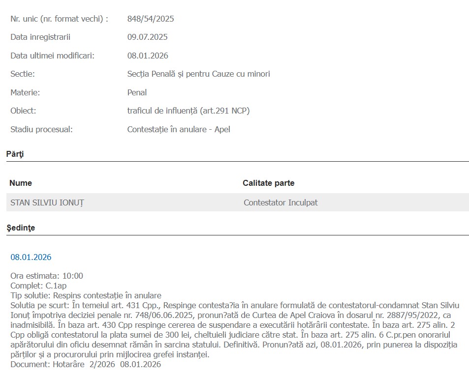 „În temeiul art. 431 Cpp., Respinge contestația în anulare formulată de contestatorul-condamnat Stan Silviu Ionuţ împotriva deciziei penale nr. 748/06.06.2025, pronunțată de Curtea de Apel Craiova în dosarul nr. 2887/95/2022, ca inadmisibilă. În baza art. 430 Cpp respinge cererea de suspendare a executării hotărârii contestate. În baza art. 275 alin. 2 Cpp obligă contestatorul la plata sumei de 300 lei, cheltuieli judiciare către stat. În baza art. 275 alin. 6 C.pr.pen, onorariul apărătorului din oficiu desemnat rămâne în sarcina statului. Definitivă”, a decis instanța din Bănie.