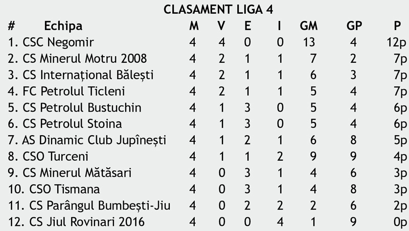 La fel ca în sezonul precedent, CSC Negomir are un început foarte bun în Liga 4. După primele patru runde, vicecampioana din ediția trecută este singura cu bilanț perfect, la 5 puncte față de următoarele trei formații. A fost o etapă cu mai puține reușite în principalul campionat județean, dar și cu meciuri mult mai strânse.