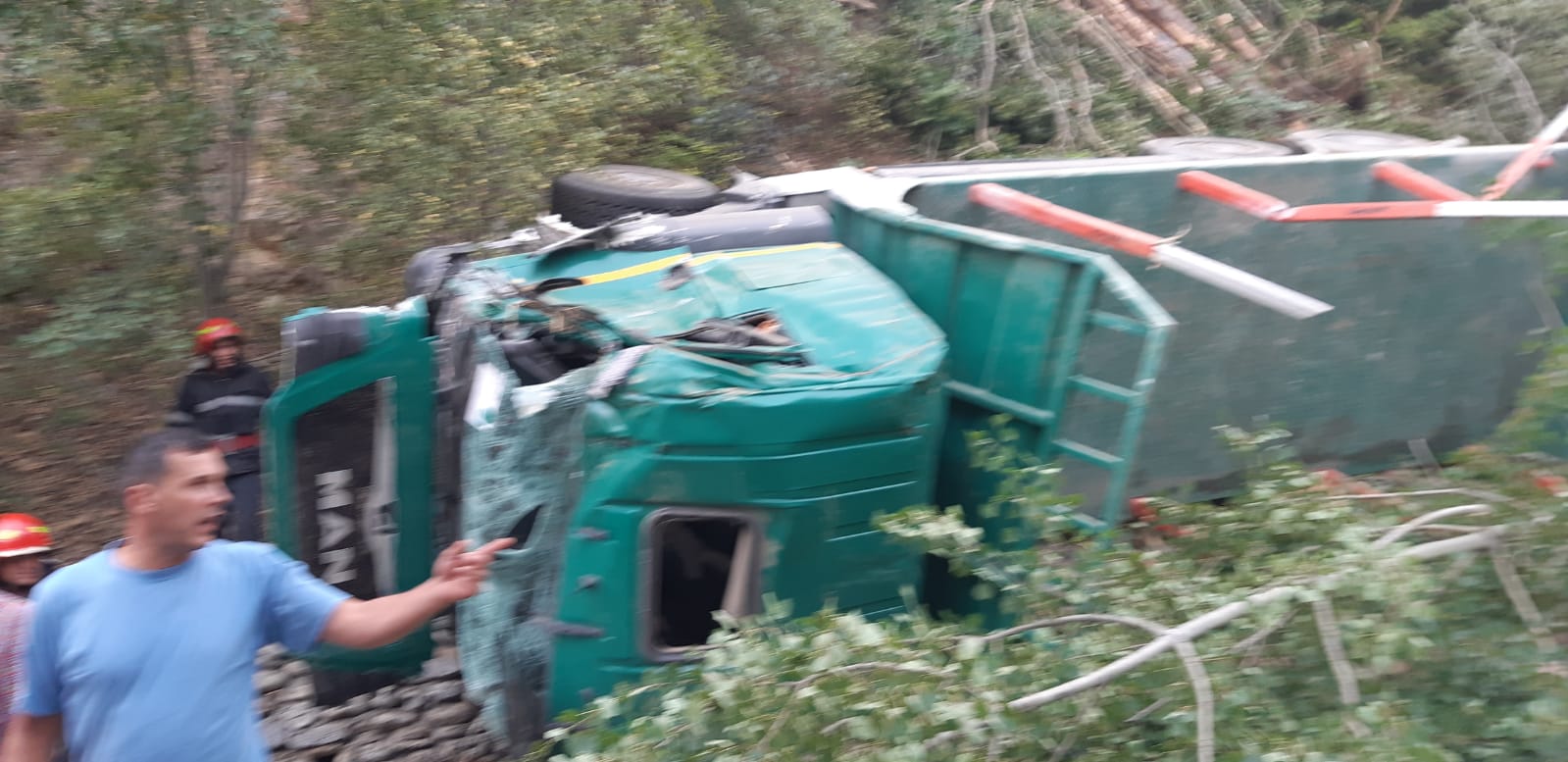 „Un camion încărcat cu lemne, în timp ce cobora din zona Rânca, pe DN 67 C, a pierdut controlul volanului și a părăsit partea carosabilă, răsturnandu-se în șanț.