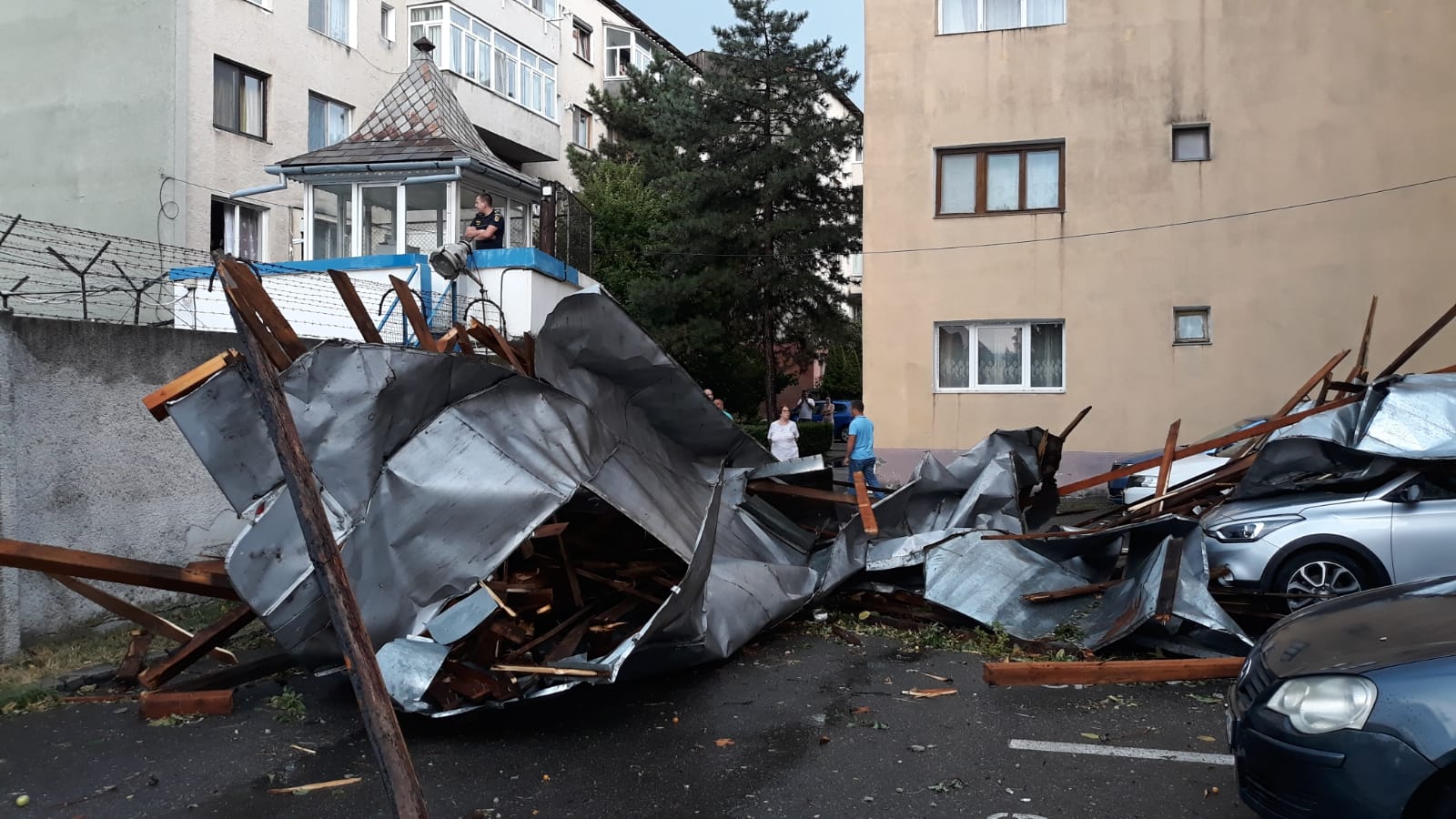 Mai multe autoturisme, parcate în fața unui imobil situat in spatele Penitenciarul Târgu Jiu au fost distruse de acoperișul căzut de pe bloc. Proprietarii mașinilor sunt disperați și așteaptă prezența autorităților.