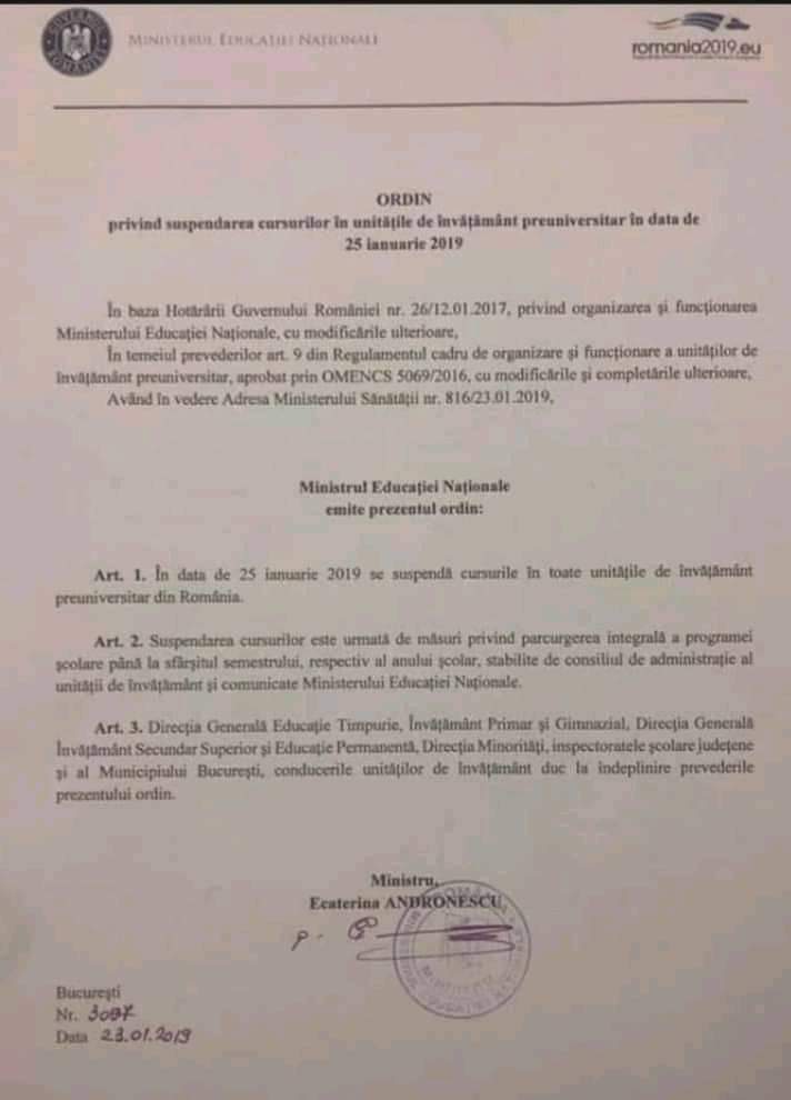 Ordinul de ministru a fost dat din cauza răspândirii gripei, după ce Ministerul Sănătăţii a trimis o adresă către Ministerul Educaţiei în acest sens. Copiii vor avea astfel 4 zile libere: joi, 24 ianuarie, liber de ziua Unirii Principatelor Române, vineri 25 liber și cele două zile de weekend.