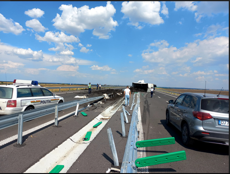 Un camion cu numere de Gorj s-a răsturnat, astăzi, la km 32 al drumului ocolitor Slatina. În cădere, mașina a distrus parapeții și panourile antiorbire. Circulația este blocată.