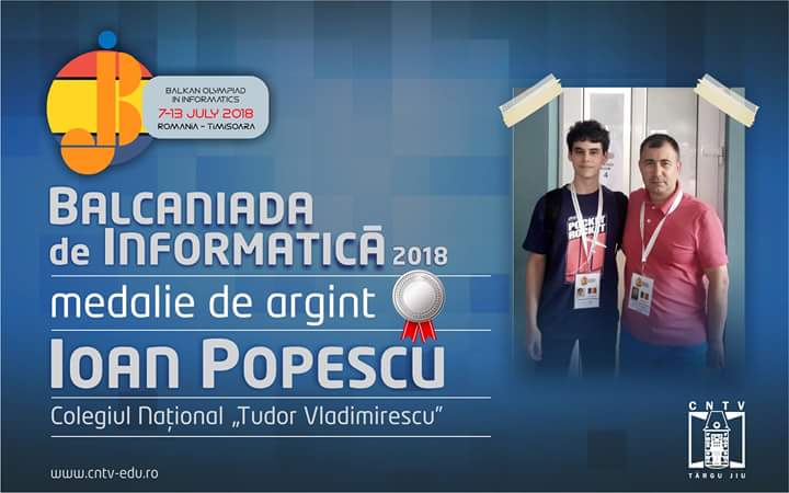 Giovani Popescu, elev in clasa a IX a C la Colegiul Național „Tudor Vladimirescu” din Târgu Jiu a obținut în urmă cu câteva zile Medalia de Argint la Olimpiada Balcanică de Informatică 2018 (seniori), ce s-a desfășurat în perioada 7-13 iulie 2018 la Timișoara. Acesta este un rezultat de excepție, târgujianul fiind cel mai tânăr participant din competiție. Elevul este pregătit de prof. Eugen Nodea.