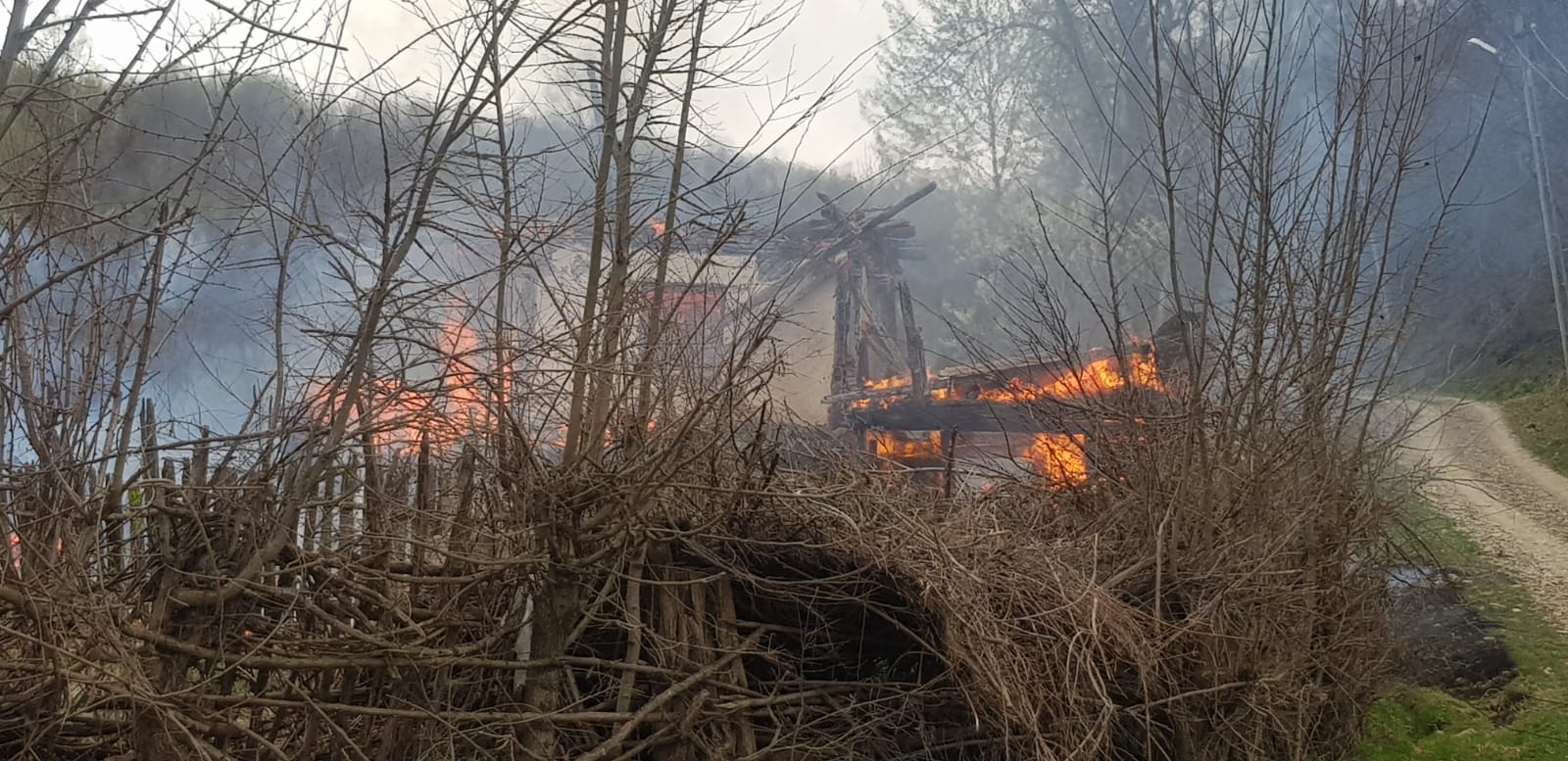 Proprietatea a fost distrusă în mare parte de flăcări.Drumul de acces spre proprietatea în flăcări le-a dat bătăi de cap pompierilor.