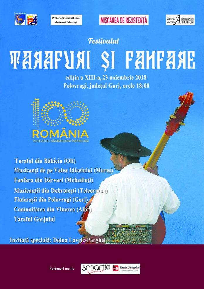 Şcoala Populară de Artă din Târgu Jiu, alături de Consiliul Județean Gorj,  Primăria şi Consiliul Local Polovragi, Asociaţia Culturală „Arhetipuri: Datini, Muzică, Rost” şi Asociaţia Mişcarea de Rezistenţă organizează vineri, 23 noiembrie 2018, începând cu ora  18:00, la Polovragi, Festivalul Tarafuri şi Fanfare, ediţia a XIII-a.